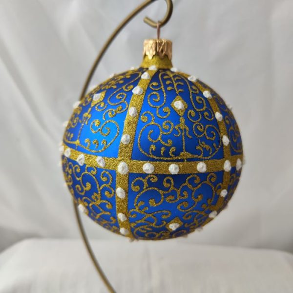 Ręcznie malowana szklana kula fi 100 mm na tle szafirowym matowym.